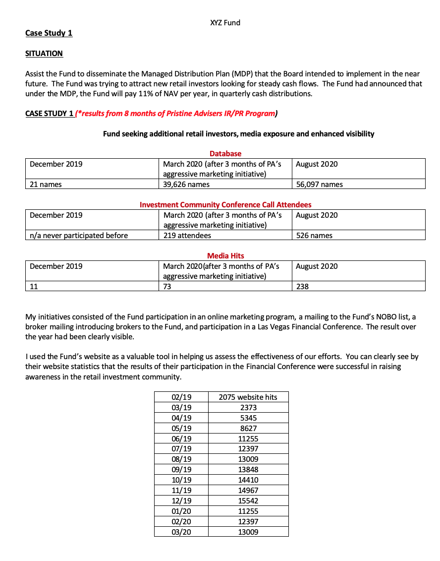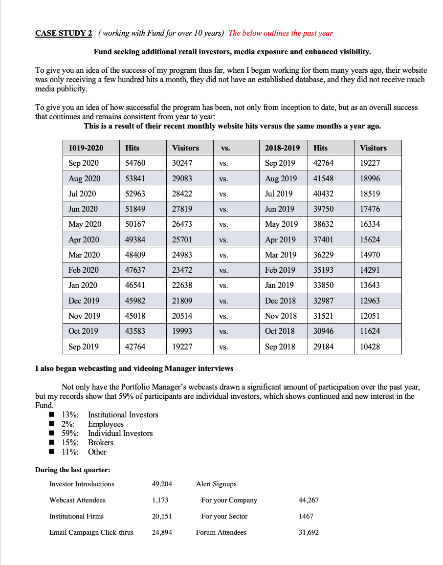 - An investor pipeline and outreach plan. A highly targeted investor pipeline and multi-channel outreach plan was established for the company, leading to productive meetings, driving investor interest in the company. The pipeline provided the systematic, data-driven framework required to put the company in front of the right investors and align presentations with investor interests.